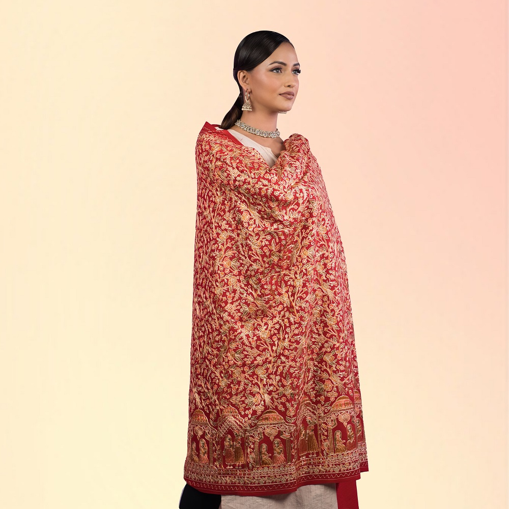 Made with skilled precision, every motif reflects the artistry of Kashmiri weavers, who bring centuries of tradition to each thread. The rich royal red color highlights the fine embroidery and ensures that the shawl stands out as a statement piece for weddings, cultural events, and festive celebrations. Its lightweight design allows effortless draping, making it versatile for both traditional and contemporary attire.