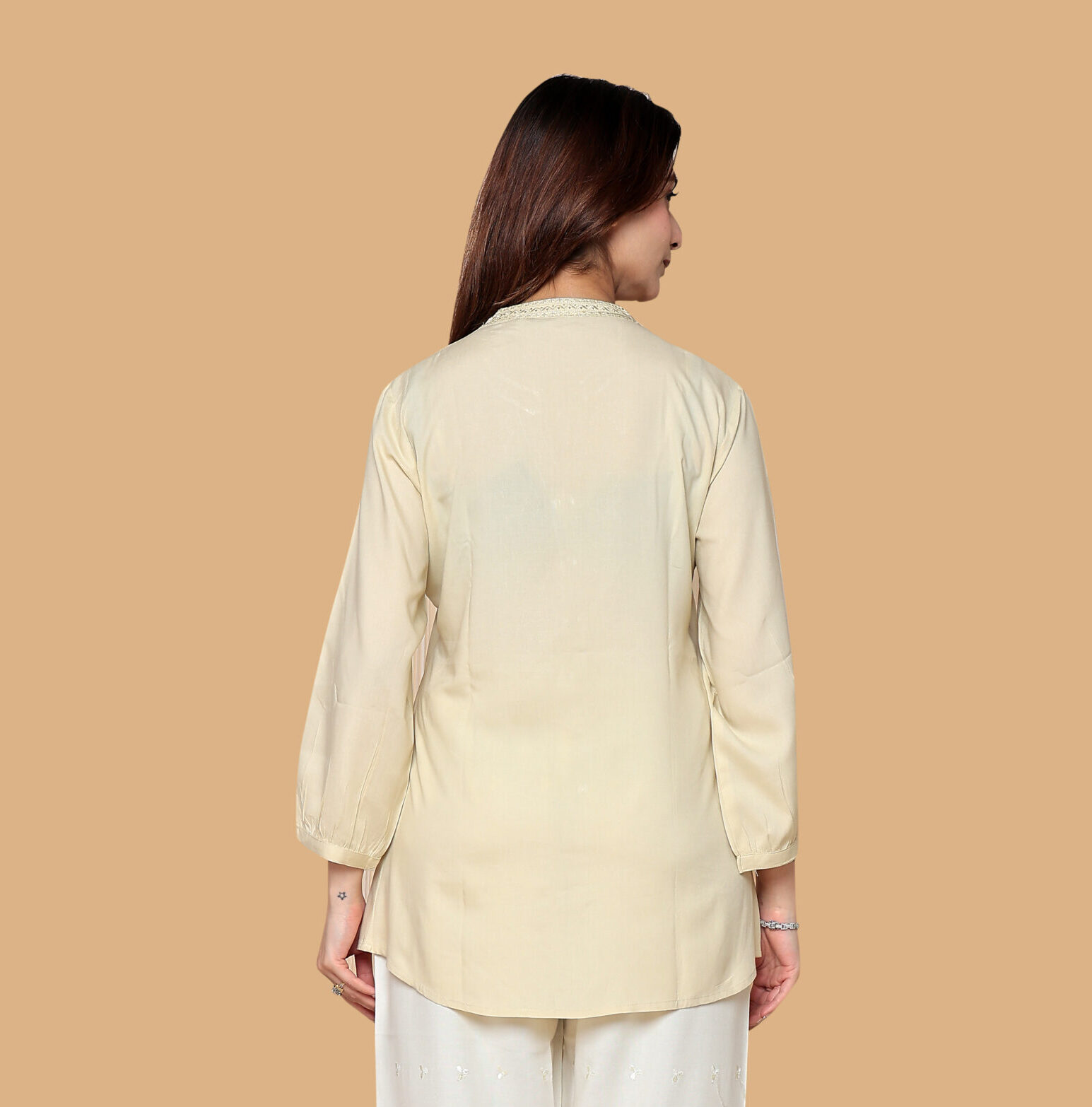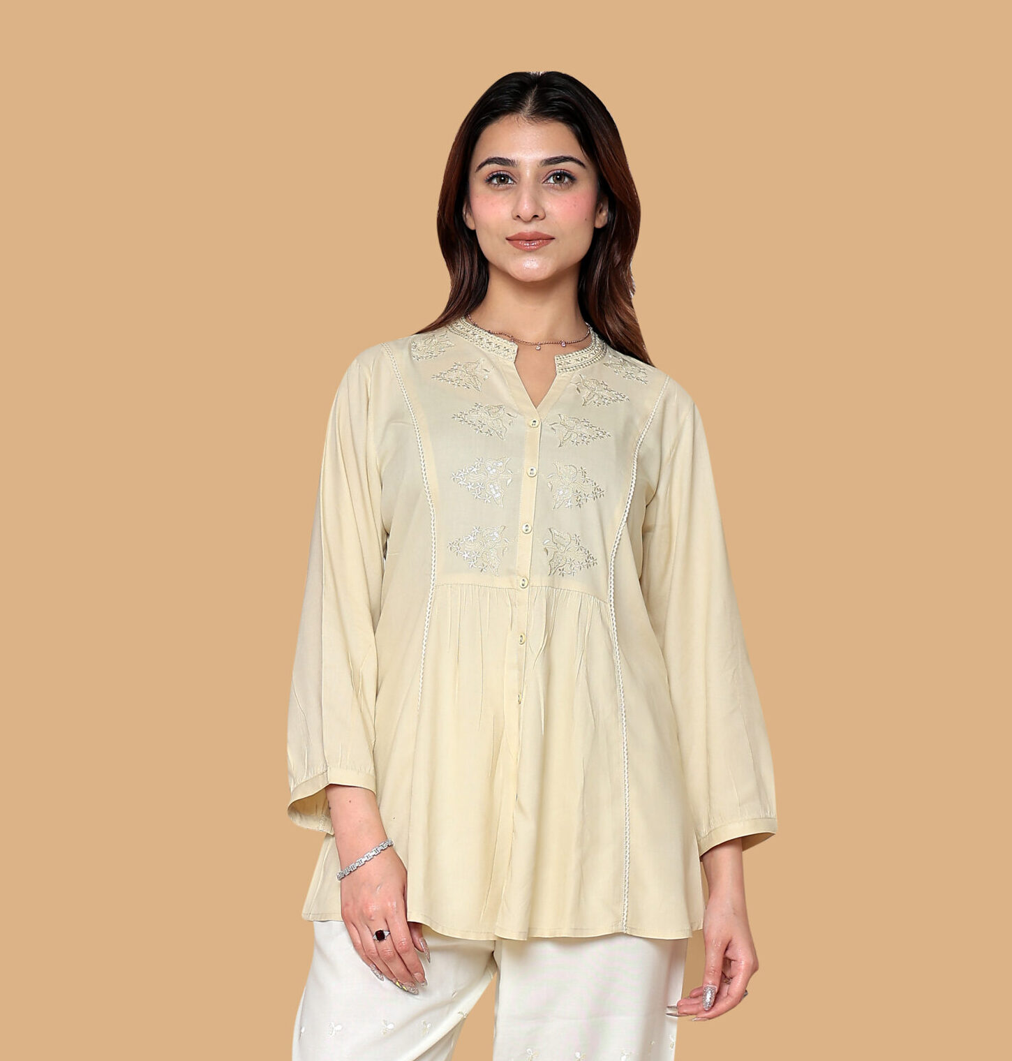 Bring effortless elegance to your ethnic wardrobe with this Cream Embroidered Short Kurti, crafted from a comfortable viscose cotton blend fabric. The kurti features delicate embroidery work that enhances its sophisticated and graceful appeal. Designed in a modern short kurti silhouette, it pairs beautifully with trousers, palazzos, or denim for a stylish Indo-western look. The soft cream color adds a refined and timeless charm, making it perfect for casual outings, office wear, and small festive gatherings.