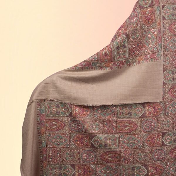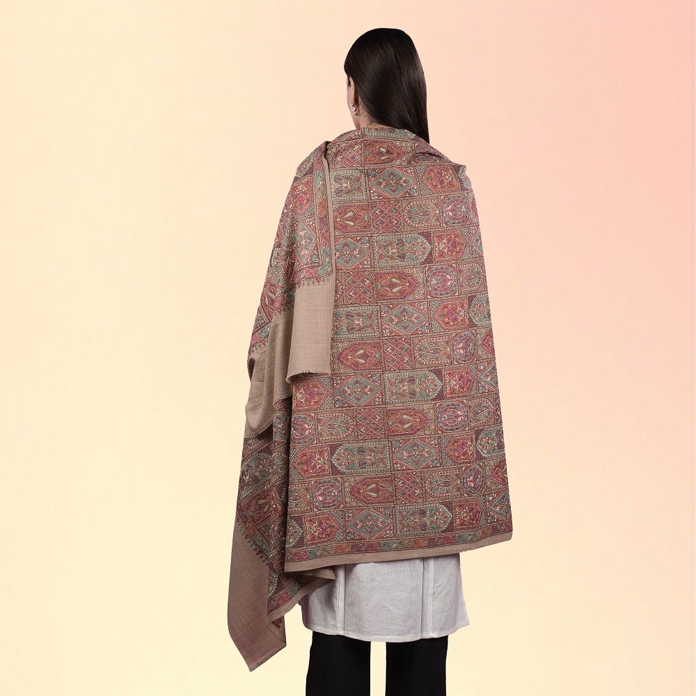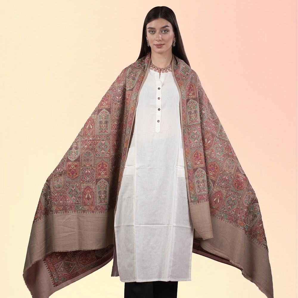 Floral print shawl lovers will admire the beauty and fine craftsmanship of the Mughal Flower Kashmiri Embroidery Shawl in an elegant Toosh shade. Inspired by the timeless floral art of the Mughal era, this shawl reflects rich heritage and graceful style in a simple and refined way.