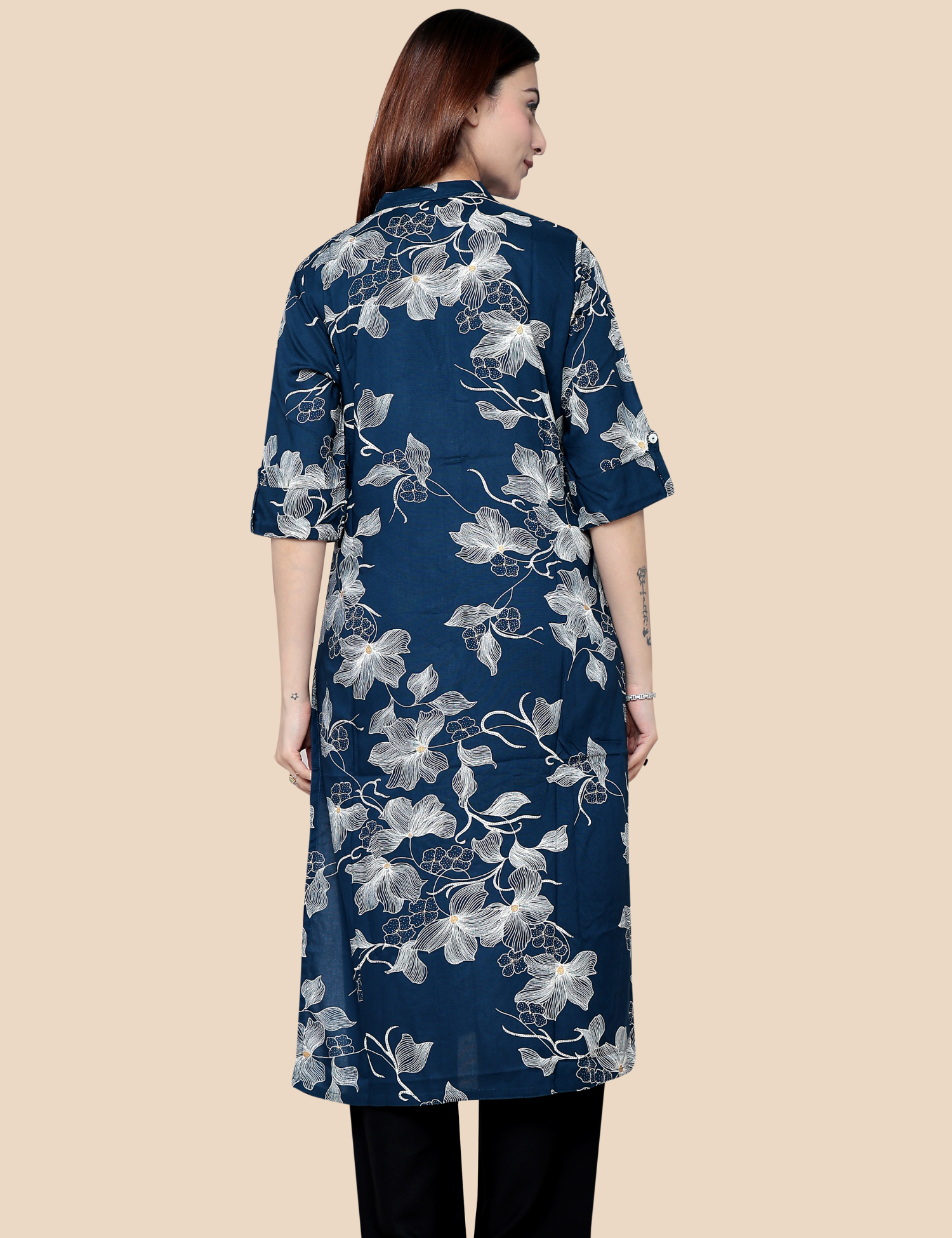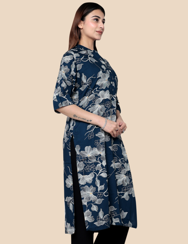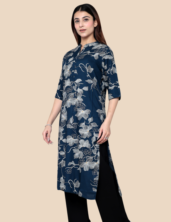 This stylish Indigo Blue Long Kurti is crafted from 100% cotton, ensuring breathability and all-day comfort. The kurti features an elegant printed design that adds a modern yet ethnic touch to your wardrobe. Designed in a graceful long silhouette, it pairs perfectly with palazzos, trousers, or leggings for a sophisticated everyday look. The rich indigo blue color enhances its appeal, making it suitable for casual outings, office wear, and festive gatherings.