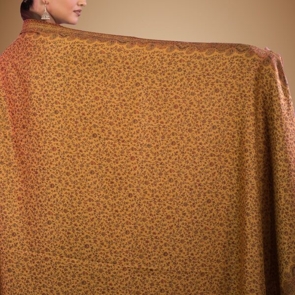 More than just a winter layer, this Kashmiri textile represents cultural heritage and timeless fashion. The balanced pattern ensures the look remains graceful rather than heavy, while the golden ochre shade brings vibrancy without overpowering your attire. This harmony makes it suitable for both subtle styling and statement dressing.
