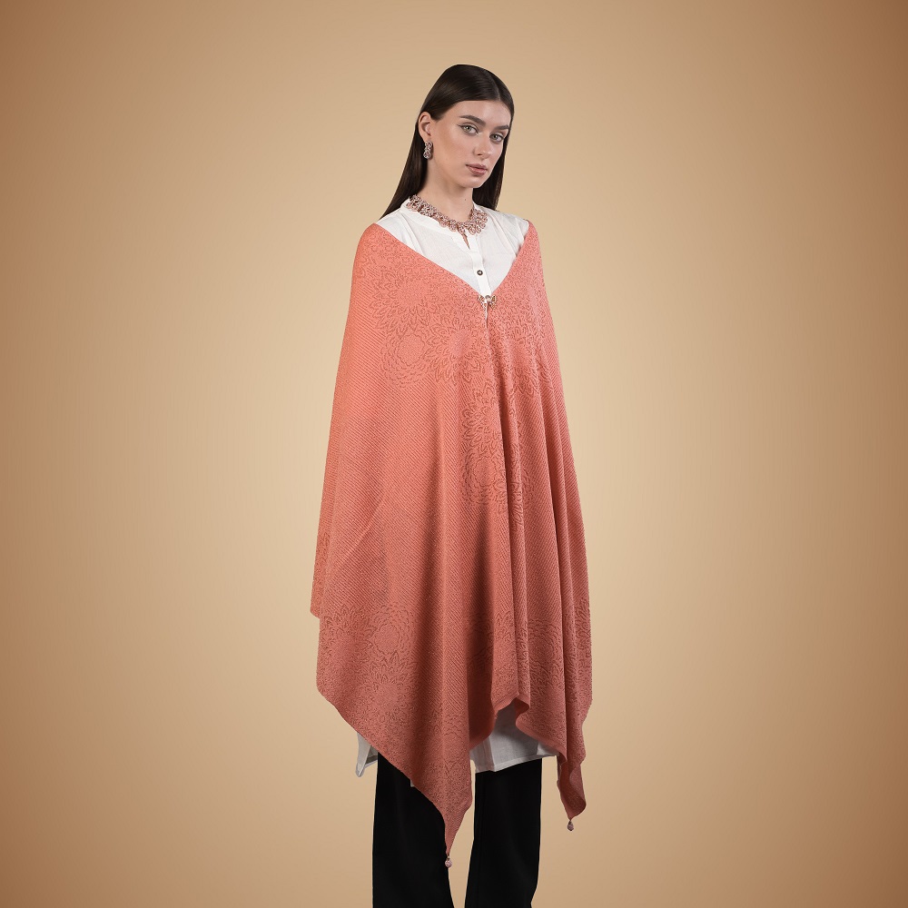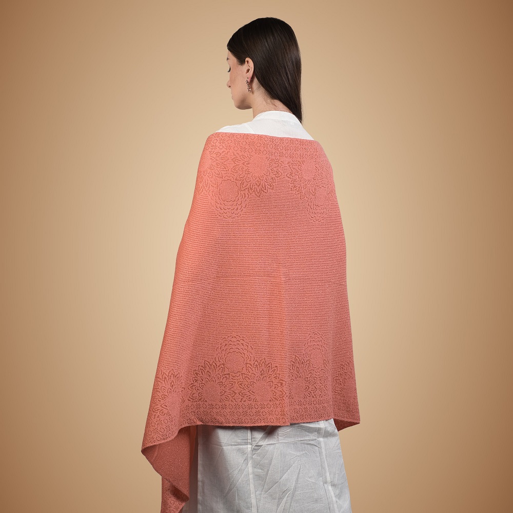 The Woolen Floral Border Knitted Stole in a soft rose peach hue beautifully combines warmth with delicate craftsmanship. Made from 100% acrylic with fine filament, it offers a lightweight yet cozy feel along with lasting durability. The subtle floral detailing along the edges adds a graceful finish, making it an elegant example of a refined ladies stoles design with border.