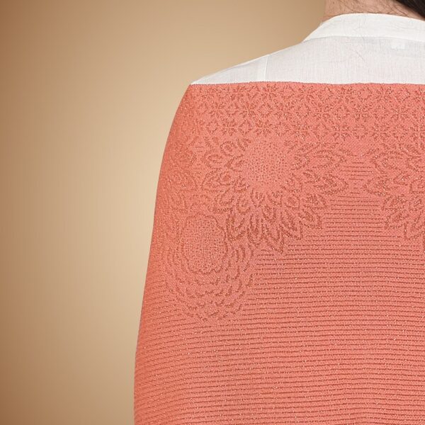 Ideal for everyday wear, casual outings, or winter layering, this versatile stole complements coats, sweaters, kurtas, and modern outfits with ease. Its soothing peach tone and finely finished border enhance its feminine charm, adding warmth, softness, and understated elegance to your seasonal wardrobe. This timeless piece stands out as a stylish ladies stoles design with border for women who value comfort and elegance.
