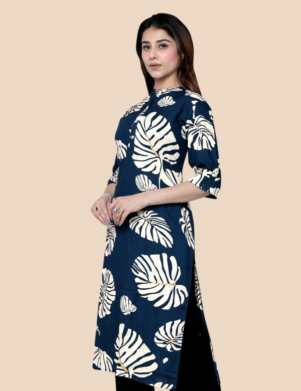 The long kurti silhouette provides a flattering and comfortable fit that suits different body types. It can be easily paired with leggings, palazzos, or straight pants to create a stylish everyday outfit. Whether you are going to work, college, or a casual outing, this kurti offers a perfect blend of comfort and traditional style.