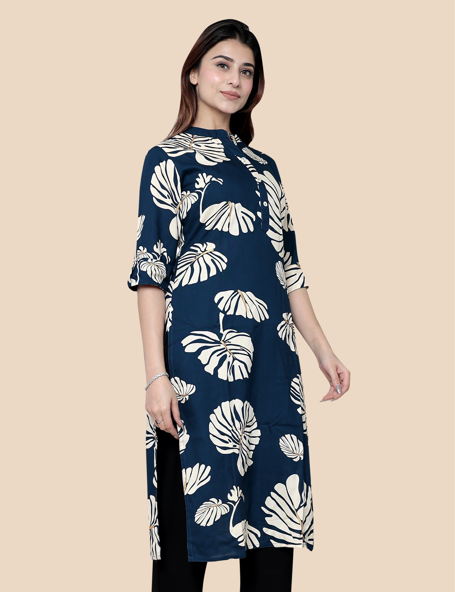 This Navy Blue Printed Long Kurti features a flattering long silhouette that complements all body types. Its versatile design allows you to pair it effortlessly with leggings, churidars, or palazzos, creating multiple stylish looks for different occasions.