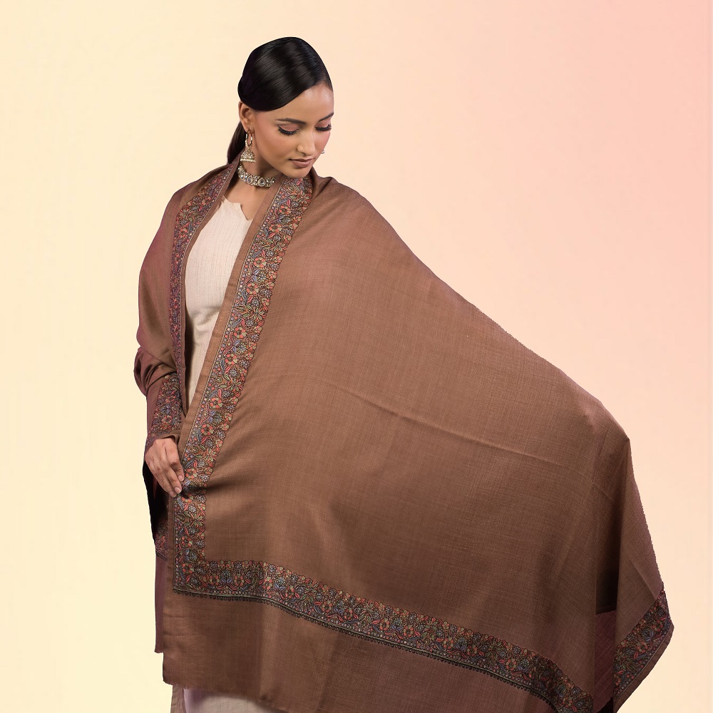 The floral border embroidery defines the Sarojini Floral Border design. Kashmiri artisans place each motif with care. These details showcase generations of textile artistry. The borders add depth without overpowering the look. The contrast between the cocoa tone and fine embroidery enhances the overall appeal.
