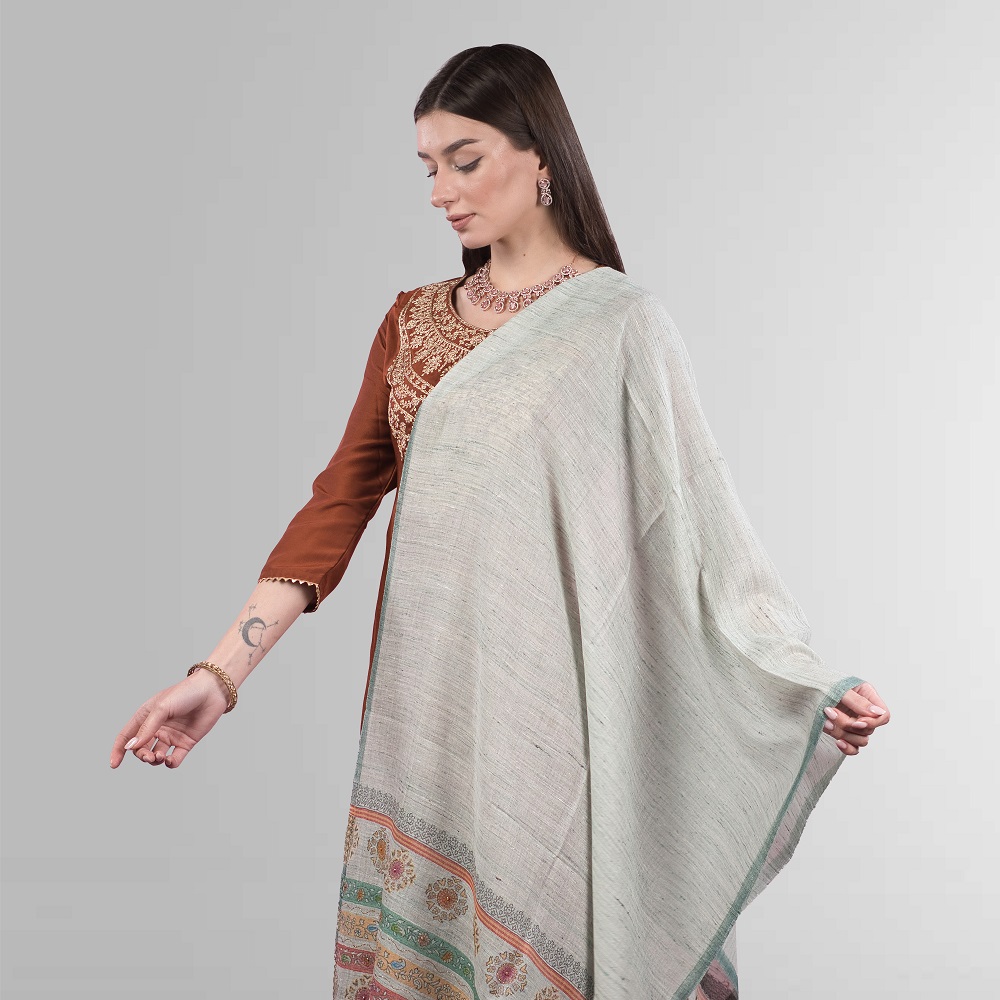 The Mridula Rangrekha Pure Wool with Angora Stole is a graceful combination of warmth, luxury, and refined craftsmanship. Designed in a soothing tonal pista shade, this stole reflects quiet elegance. The delicate rangrekha-inspired accents bring artistic depth while keeping the look subtle and sophisticated. Its calm green tone makes it suitable for both traditional and modern styling.