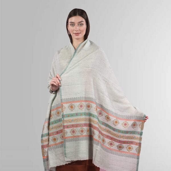 Crafted from a premium blend of pure wool with angora, the fabric feels exceptionally soft and plush. It provides natural insulation while remaining lightweight and breathable. This balance allows you to stay comfortable without feeling bulky. The smooth texture also helps the stole drape beautifully over the shoulders and maintain a neat silhouette throughout the day.
