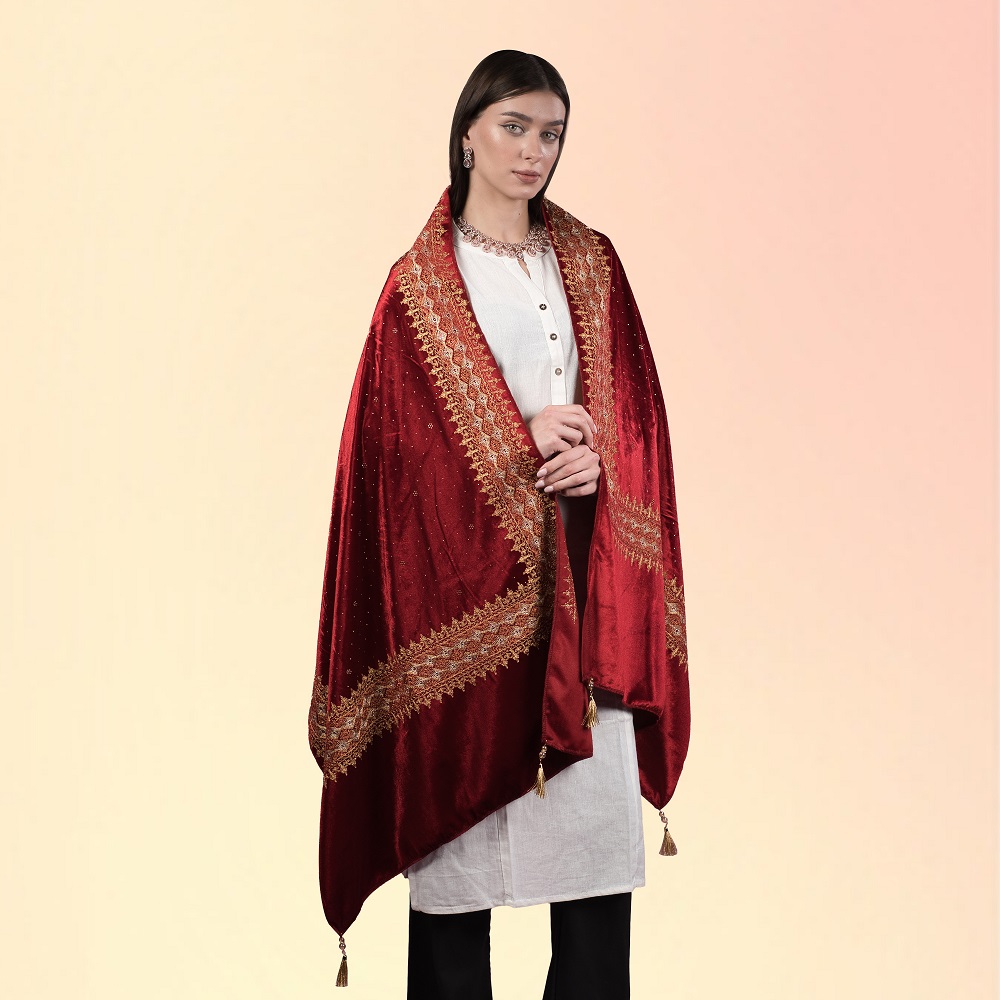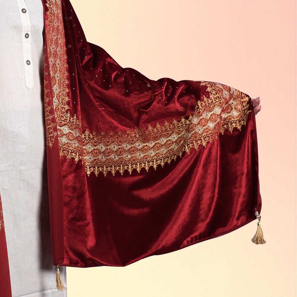 The Shaam-E-Daastan Veil is a graceful celebration of timeless elegance, designed to elevate evening and occasion wear. Crafted from pure soft velvet, this piece features a rich, plush texture and a smooth, flowing drape that feels as luxurious as it looks. The deep royal maroon shade reflects warmth, romance, and regal sophistication, making this velvet stole for wedding styling a perfect choice for refined ensembles.